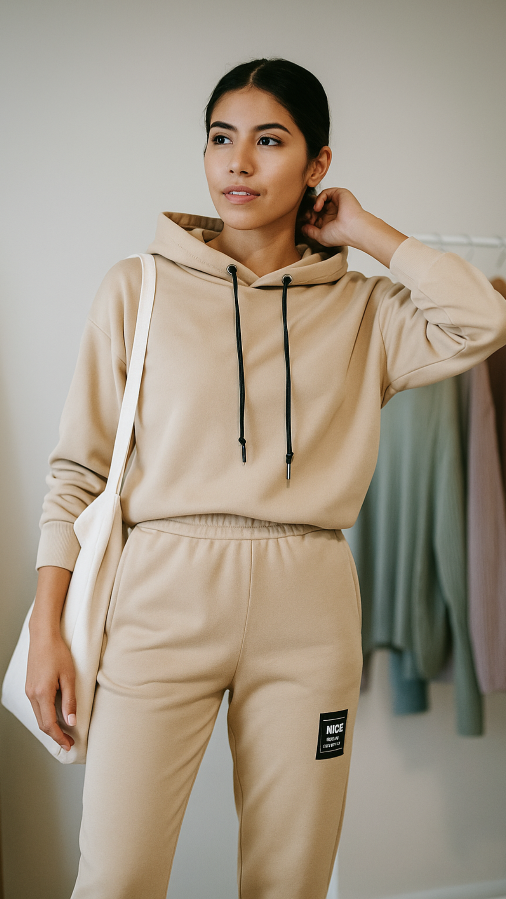 Avvolgente e leggero, questo completo a due pezzi accompagna con naturalezza ogni tuo movimento, regalando una sensazione di calma e fiducia. La felpa con cappuccio cade dolcemente lungo la figura, mentre i pantaloni con vita regolabile seguono il corpo con libertà. Le sottili strisce laterali aggiungono un tocco sportivo e armonioso, perfetto per vivere ogni giornata con stile e comfort.